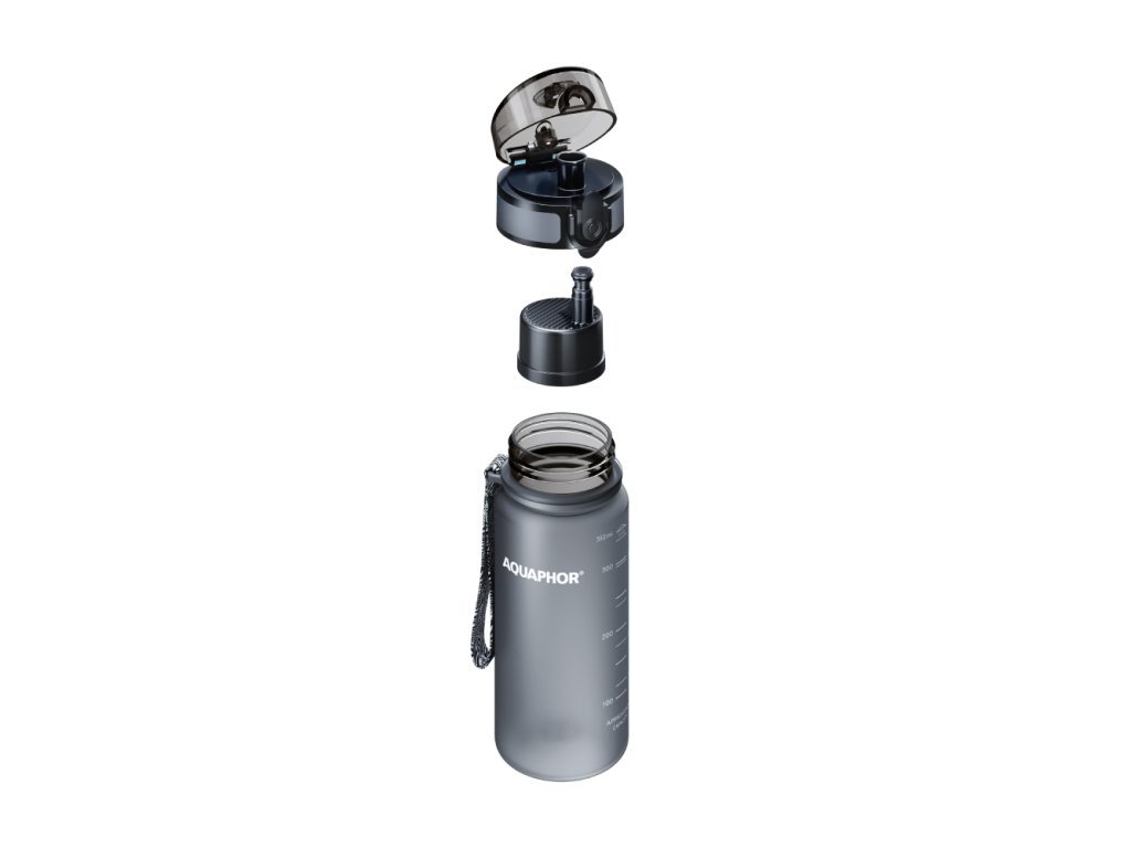 Povrch fľaše je pokrytý matným, zamatovým poťahom, ktorý je príjemný na dotyk a znižuje riziko vykĺznutia, ak keď máte mokré ruky. Má značenie objemu v mililitroch a unciach, čo uľahčuje sledovanie denného príjmu vody. Fľaša je naviac vybavená praktickým širokým popruhom, ktorý uľahčuje držanie fľaše a zaisťuje bezpečnú manipuláciu. Špeciálny uzáver bráni nechcenému otvoreniu a rozliatiu vody.