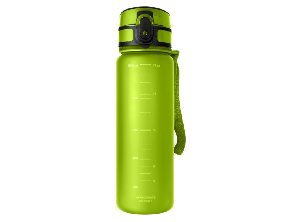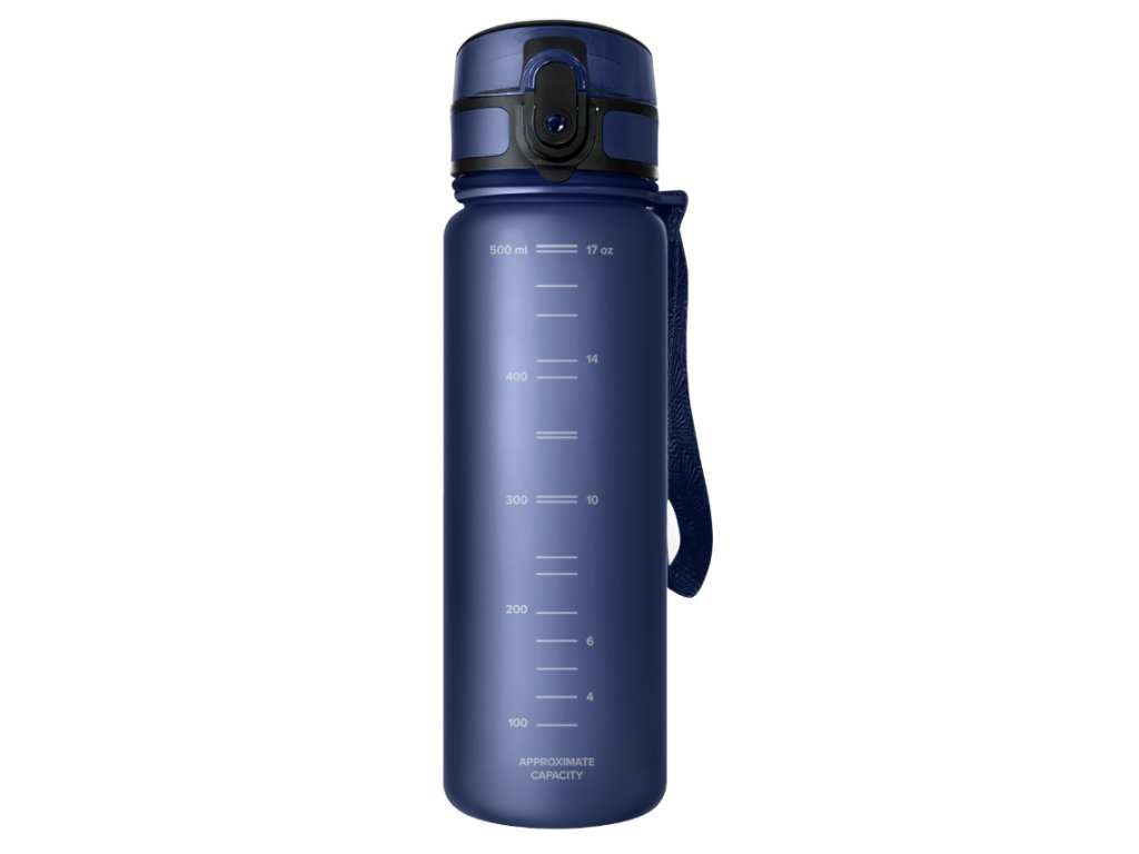 Povrch fľaše je pokrytý matným, sametovým poťahom, ktorý je príjemný na dotyk a znižuje riziko vykĺznutia, aj keď máte mokré ruky. Má značenie objemu v mililitroch a unciach, čo uľahčuje sledovanie denného príjmu vody. Fľaša je naviac vybavená praktickým širokým popruhom, ktorý uľahčuje držanie fľaše a zaisťuje bezpečnú manipuláciu. Špeciálny uzáver bráni nechcenému otvoreniu a rozliatiu vody.