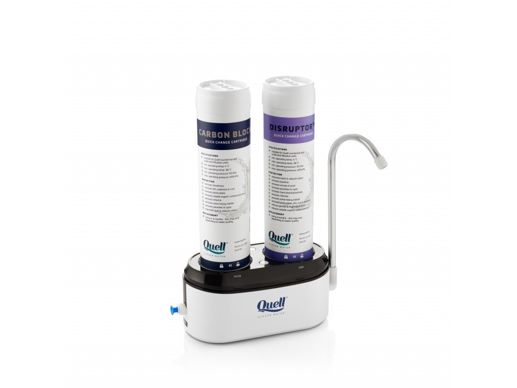 Dvojstupňová filtračná jednotka Quell s prietokom 2,5 l/min Vám zaistí čistú filtrovanú vodu bez zápachu a nežiadúcich látok. Filtrovaná voda sa vyznačuje sviežou chuťou bez chlóru. Filtračná jednotka obsahuje dva stupne filtrácie, prvý je uhlíkový filter a druhým stupňom je vložka s technológiou Disruptor™.