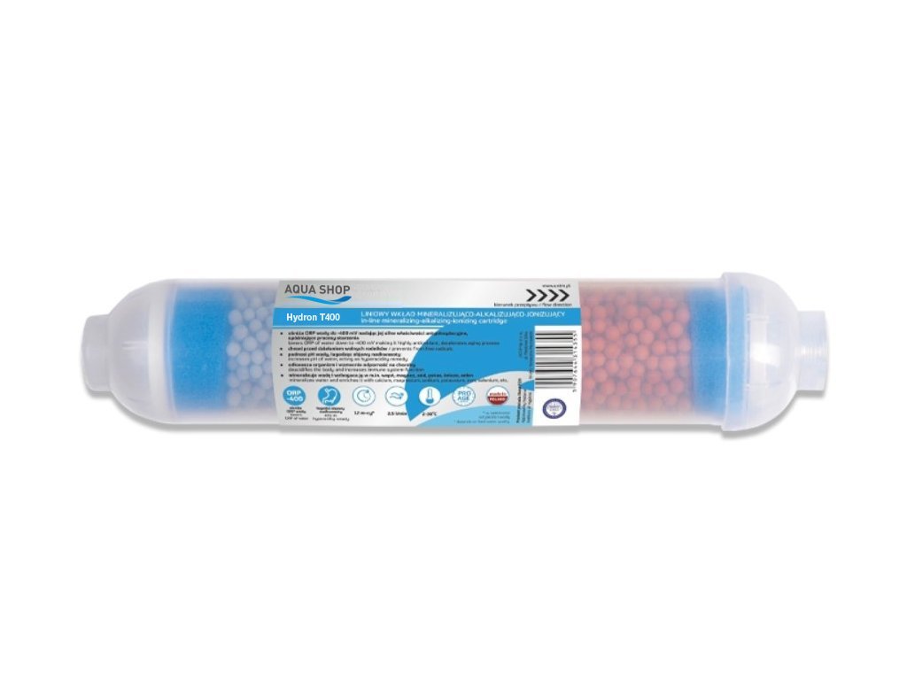 HYDRON T400 je najnovší inline na trhu, ktorý filtrovanú vodu obohacuje o vodík a ionizuje vodu, ktorá je prospešná pre ľudský organizmus. Inštaluje sa prevážne ako posledný stupeň filtrácie na filtre reverznej osmózy, ale taktiež na prietokové systémy. Jeho životnosť je 6-12 mesiacov podľa spotreby vody a nahrádza dodatočnú mineralizáciu.